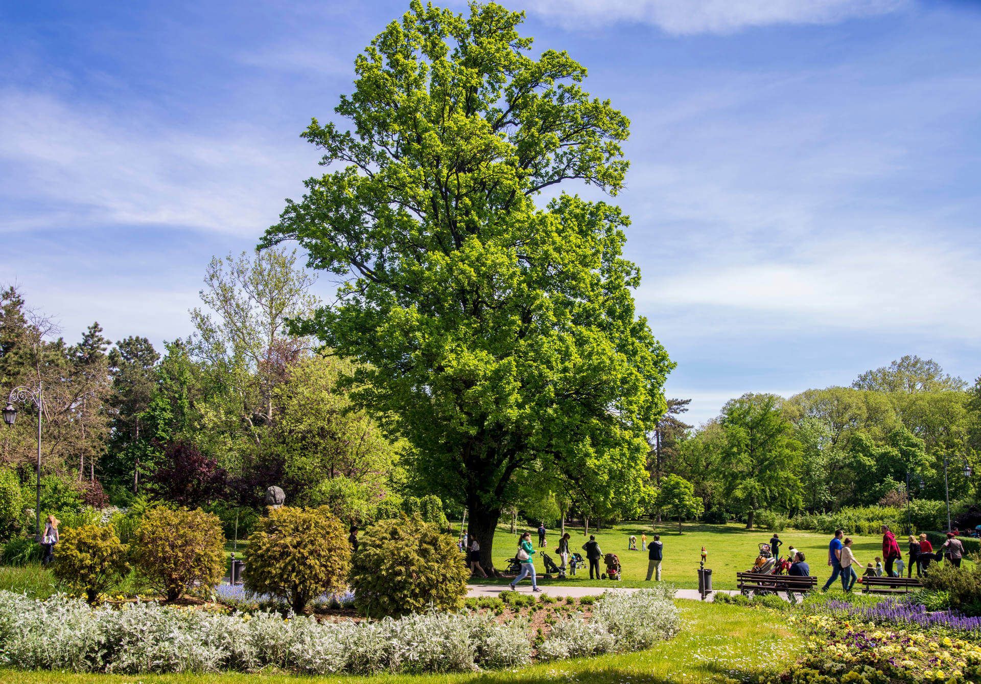 Парком доминирају високи лишћари, како по броју заступљених врста, тако и по броју присутних примерака. Заступљене су  многе алохтоне врсте, и то стабла ликвидамбра (Liquidambar styraciflua L.), састојине стабла софоре (Sophora japonica L.) и црног ораха (Juglans nigra L.) великих размера, као и магнолије (Magnolia liliflora Desr. и Magnolia stellata Maxim.) и др. Од високих лишћара у парку се налазе и аутохтоне врсте типичне за низијске пределе- храст лужњак, бела топола, вез.